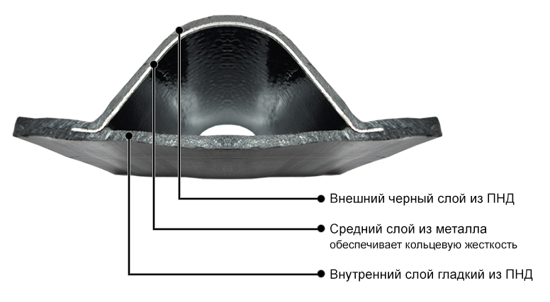 Металлический слой интегрирован в полиэтилен, что обеспечивает ему отсутствие коррозии и исключает контакт с транспортируемыми жидкостями.